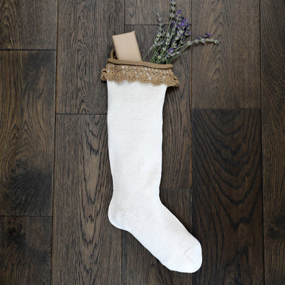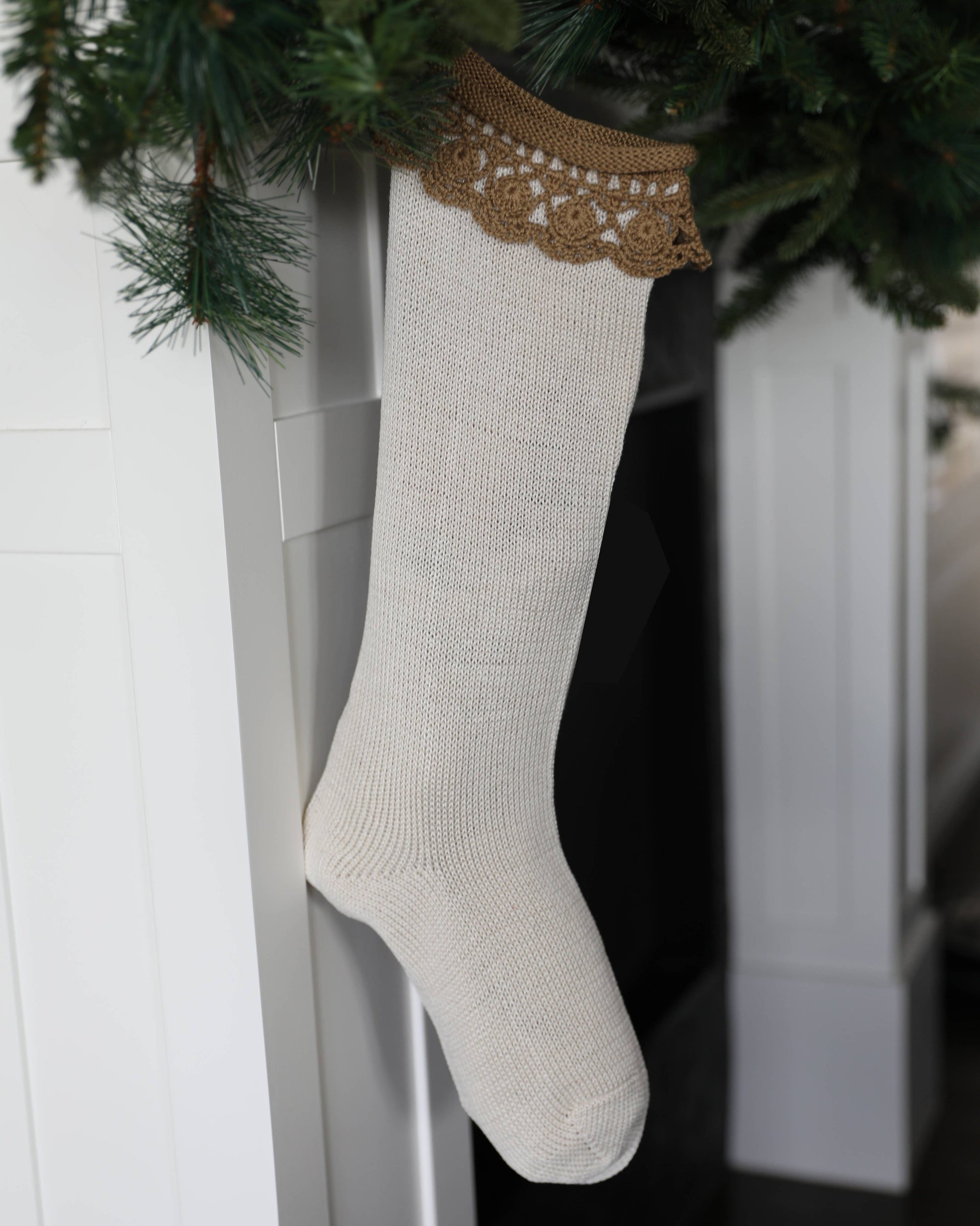 Add a touch of bohemian charm to your holiday décor with this elegant knit stocking. Featuring a soft, cream-colored base, this stocking brings warmth and simplicity to your festive celebrations. The standout feature is the intricate crochet trim in a rich, cocoa brown, giving the stocking a handcrafted, artisanal appeal that perfectly complements a rustic or boho-inspired aesthetic. 18" long 100% cotton Hand wash with mild soap; lay flat to dry.