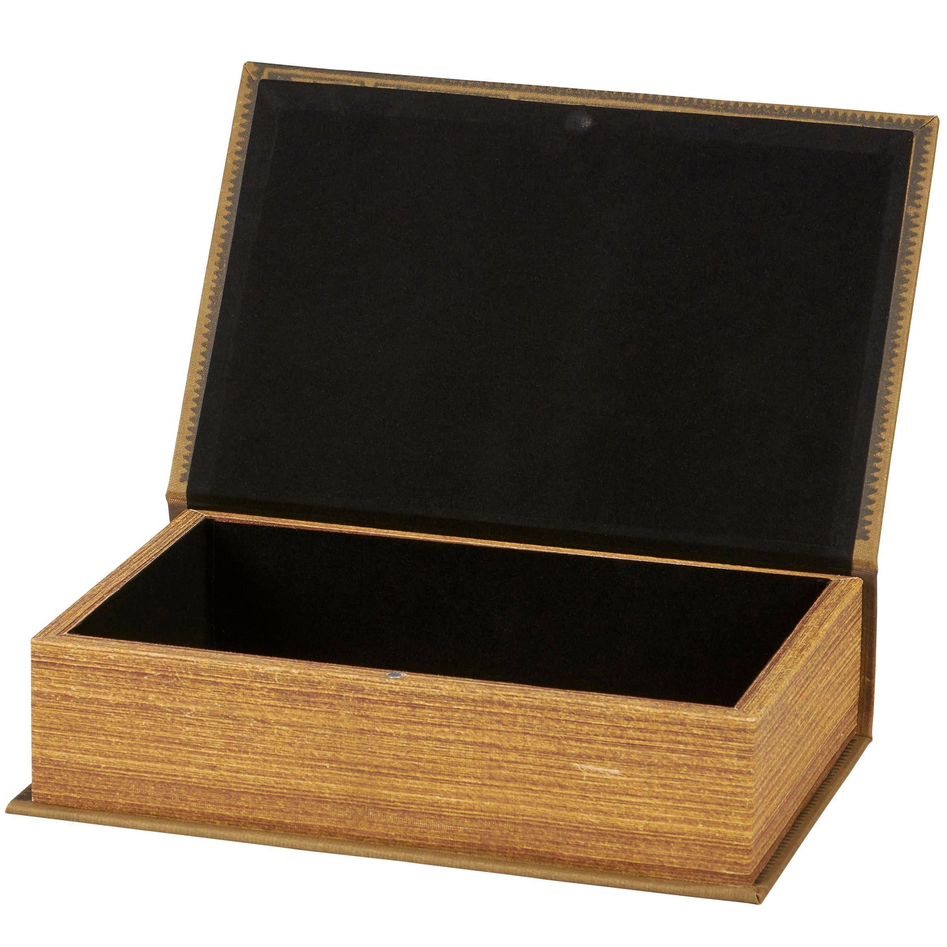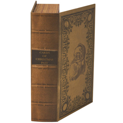 A decorative box from our Christmas Collection displaying the appearance of a book inspired by vintage holiday décor. Book box features a textured canvas wrap displaying the exterior of an aged book with a vintage Santa design on the cover and sentiment on the spine that reads "Cards Of Christmas Past." Front cover opens to reveal a velvet lined space for storing items and a magnet closure for secure storage when standing up. Our Christmas Past book box can be used upright as a book or displayed laying down with the cover open and decorative accents inside. Accessories pictured not included. A rustic home accent perfect for storing keepsakes or for seasonal décor displays.
