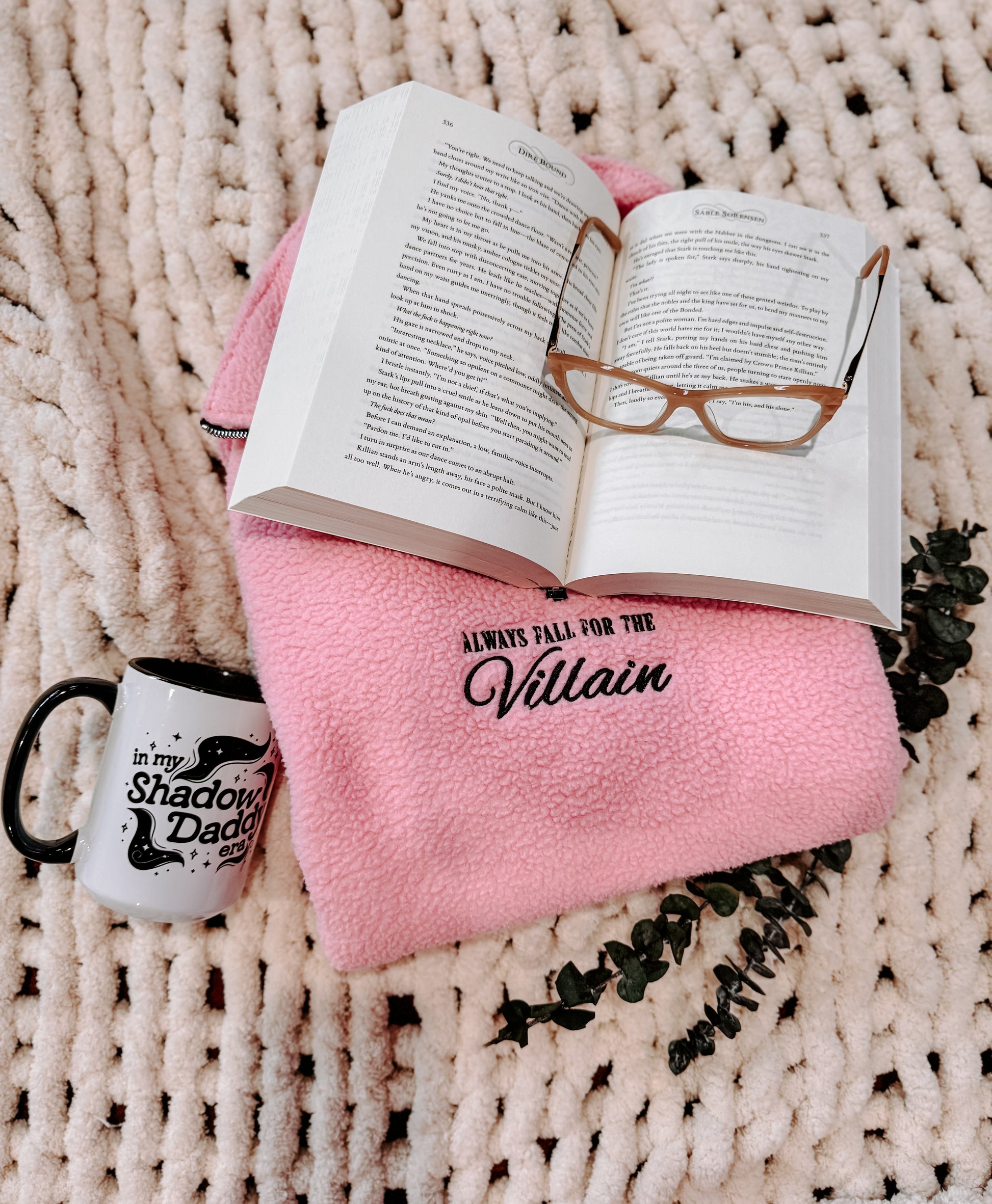 Stay warm while showing off your bookish side. Our Always Fall for the Villain Sherpa Pullover is a soft, bubblegum pink quarter-zip embroidered with the phrase every dark romance reader knows to be true: “Always Fall for the Villain.”