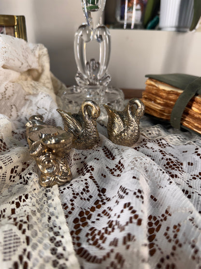 This elegant vintage set features two beautifully detailed silver-tone swan salt and pepper shakers resting on an ornate matching stand. Each swan is sculpted with sweeping wings, graceful curves, and textured feather detailing—giving the whole piece a timeless, romantic feel.